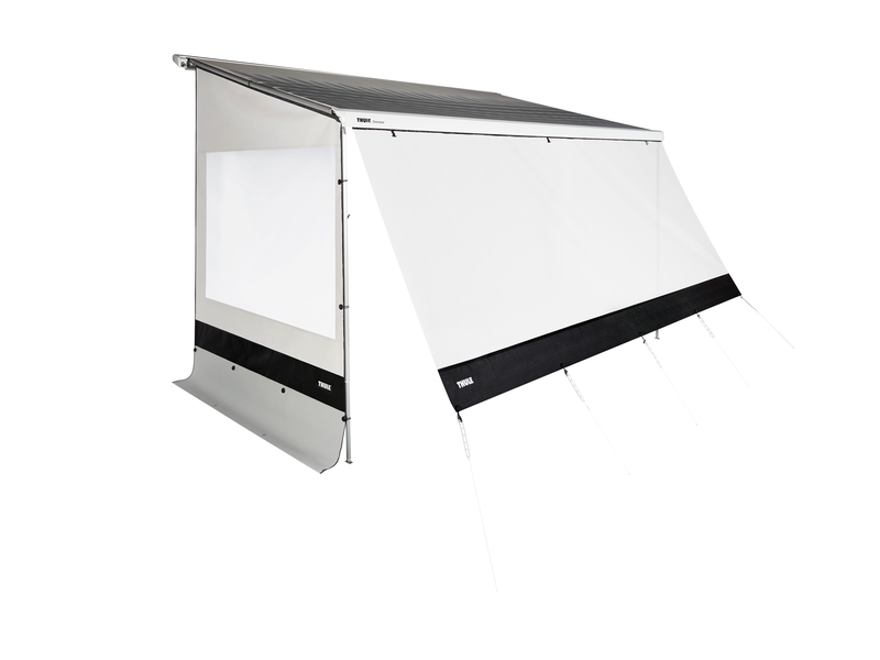 O painel de privacidade frontal para toldos Thule permite que a brisa entre e bloqueia o sol.
